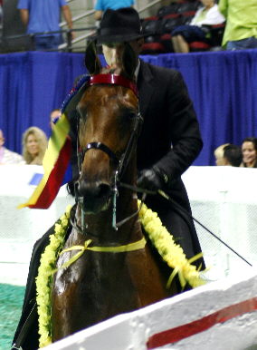 Year in and year out Joan Lurie presents babies who are right at the top and this year was no exception. Sired by the much talked about Undulata’s Nutcracker and out of the 1998 and 1999 Five-Gaited World’s Grand Champion CH Garland’s Dream, Undulata’s Dream Team was the first world’s champion crowned for 2007. The exceptional weanling earned more than $14,000 in prize money and the Susan Olcott Memorial Trophy for owner/breeder Hoppy Bennett with Lurie on the lead. Marching a strong trot off of both ends, Diamonds and Orchids (Nureyev x The Irish Orchid) was named the reserve world’s champion with Smith Lilly presenting for Sue Nifong. The Lilly/Nifong team has been quite successful in the futurity classes at Louisville over the past few years and this year’s effort earned a paycheck of a little over $7,000.