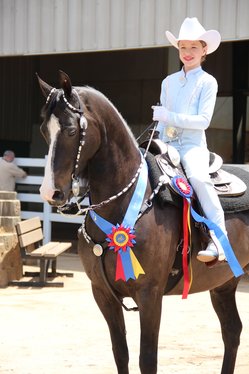Alayna LoCascio and Hollybrook Domino CH had big smiles after their winning performance in the Western Pleasure Walk/Jog 11 & Under Championship. Alayna and her sister, Sydney, were two of the winningest junior exhibitors at the Southern States Regional Morgan Horse Show. They are trained by their mother, Manya Smalley.