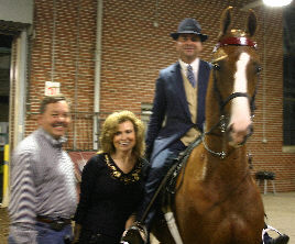 With a little break from Louisville announcer Peter Fenton commanded attention and added his insight from center ring, along with top ringmaster Kent Moeller and music maker, organist Gene Wright. There was no lull at this show as The Jazz Renegades Dance Band filled the air with their music while special guests, composer Jamie Aikman and vocalist Dave Newman, entertained the crowd Tuesday night during sessions at the All American Cup. Jamie who joined his father, Jim Aikman, many times and for many years in center ring tailing weanlings and yearlings is now proudly adding a new dimension to his father’s creation, the All American Cup. Jamie’s music is also featured in the video biographies of the trainers now being produced by his father and dedicated to the promotion of the American Saddlebred.