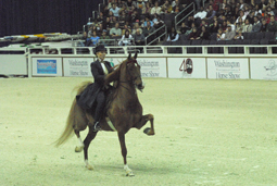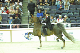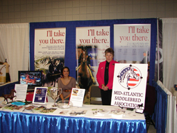 While Saddlebreds no longer participate in the horse show, many of the breed’s world’s champions were invited to exhibit at the prestigious event’s 50th anniversary. The Mid-Atlantic Saddlebred Association picked up the opportunity to promote the horse "America made", and set up a booth on the first official day of the show, Oct. 21. Posters, banners, literature and buttons drew in the crowds, non-equestrian as well as those from the hunter-jumper world, informing and entertaining them about the American Saddlebred.