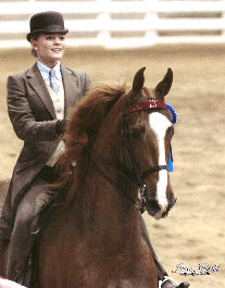 Eileen Malloy Molzberger of Waukesha, Wisconsin, began riding horses 16 years ago, but her focus shifted to the American Saddlebred within last few years – following her first saddle seat lesson and after attending her first Saddlebred show. By 2003, she had her first Saddlebred but could not afford to keep her horse in training. Eileen chose the challenge of training the horse herself, while taking lessons with Bonnie Kittredge of Woodwind Farm.