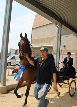 Caretaker Jesus De La Cruz headed Kentucky Spring Premier’s Three-Year-Old Fine Harness Champion Rose Arbor Heartbreaker with trainer Dena Lopez on the lines for owner and breeder Joellen Fisher Blount.