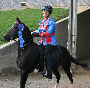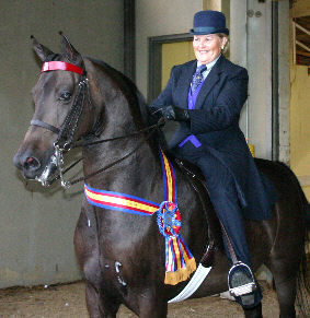 The Freseths’ Hollow Haven Farm has enjoyed the hospitality and competition at the Blue Ridge Classic for the past few years and they were back with a championship string. One of CH Blackberry Delight’s stablemates, CH The Shadow Knows, had a good warm up for Louisville with a Blue Ridge victory pass. Linda Meyer was again in the saddle for the Adult Country Pleasure win. Reserve streamers went the way of Marie Gwinn and VHF Bay All Day.