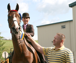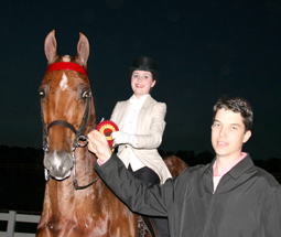 David Cater congratulated Margaret McCool on her comeback ride with Golden Market to capture the Junior Exhibitor Three-Gaited Reserve Championship title.