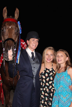 Georgia Ferreira joined Susan Swope, wearing her flower blanket, after Swope rode Talk Is Money to win Mercer County Fair’s Three-Gaited Championship. ? Melinda Moore was joined by Perry Heathcott (center) and Ryan Visser after she rode Sabotage to win Mercer County Fair’s Five-Gaited Championship. ? Pam Kincaid rode MBA The Powers That Be to the Five-Gaited Pleasure Reserve Grand Championship at Mercer County Fair and were reserve in the Bluegrass Series qualifier for owner Jane Singleton.