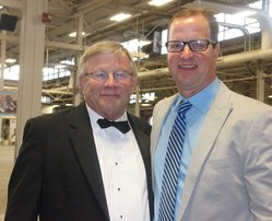 Tom Lowry congratulated Carl Nichols (l) after his homebred Crystal Creek’s Warlock won Thursday evening’s AHHS Limited Breeders Weanling Stake at the All American Horse Classic