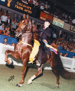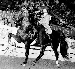 In 1982, she teamed CH City Glitter to win the Five-Gaited Amateur Mare World’s Championship and continued to earn top ribbons with the mare until CH City Glitter was retired to the broodmare band.