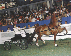 They won at the American Royal that fall and Rock Creek the next year before her final two show ring performances, both on the green shavings of Freedom Hall. In the amateur gentlemen’s qualifier they were reserve to CH Kalarama’s New Sensation and Guy Smith but came back in the Amateur Fine Harness Championship to wear the roses one last time.