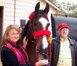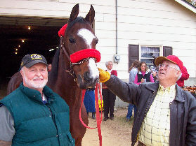 Records are only a part of this horse, however. As some know, this summer Cochise began to have problems with intermittent bouts of colic. He has spent some time at “Camp Cochrane” off and on getting well with the expert help of Dr. Richard Cochrane and the Apex Veterinary Hospital. At first it was thought he might have ulcers, but with continued treatment it was feared that he might have a more serious problem. The decision to retire him was made two months before the State Fair. After each bout he would immediately be back on his game and made one great show after another. In his last class, the Open Pleasure Driving Championship at the State Fair, some thought he looked as good as he ever had. But the next morning he was in obvious distress once again. This time it was Dr. Katy Carruthers of the Neuse Animal Clinic on call at the fair who attended him. She did a rectal examination and removed an enterolith approximately 12-18 inches. This softball-sized stone had passed completely through his digestive tract.
