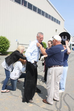 David Rand had a busy week at Greater Boston Charity. Not only did he put numerous winning teams into the ring, but he also was also in center ring. Here, his employees and customers help him change quickly at the outgate. After winning the OTAB Pleasure Driving class with Whats Up Rand only had a moment to change and get back in the ring.