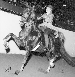 From DeLovely the athletic gelding was selected by Carolyn Garrett and put in training with George Knight. Kim Skipton got the call in the beginning and won at River Ridge, Indy, Rock Creek and Bonnie Blue before taking reserve at Lexington and third at Louisville. Carolyn took over in the fall of ’95 and captured a reserve in the amateur gaited division at the American Royal. They would continue with many good shows over the next few seasons including third in the amateur championship at Louisville.