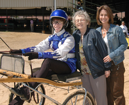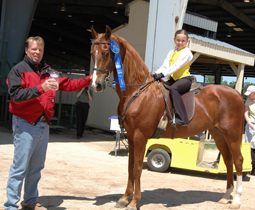 Trainer Michael Beasom of Victory Lane Farm congratulated Stace Rust after her Country Pleasure win aboard Mountainview's Good Day Sunshine.