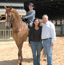 Kevin Berman celebrated his outstanding drive in the Roadster Pony Junior Exhibitor class with his grandmother, Ada Perwien, and mother, Elly Berman. Elly had a blue-ribbon ride aboard the stocking-legged bay, Uncut Jewel, in the Adult Show Pleasure qualifier.