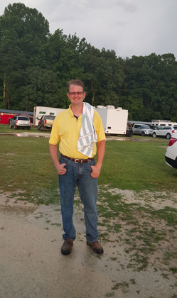 High Caliber Stables brought a nice string of horses to the UPHA Horsemans Classic. Here, Evan tries to dry off after his ride on Softly Spoken in the Junior/Novice Park Pleasure class. This duo left the ring with the red ribbon and plenty of mud!