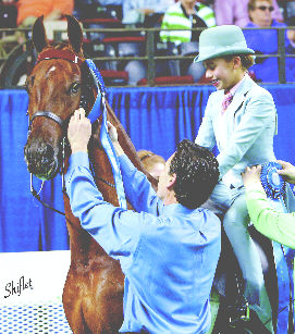 Ciampoli helped Caroline Moeller on Lady Gabriella get ready for her victory pass after winning Division I of the Saddle Seat