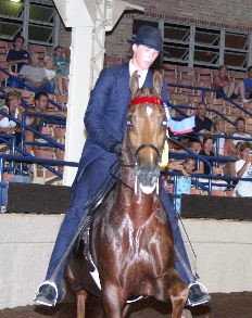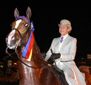 Saturday night ended the weeklong show with a bang when seven nice entries came through the gate for the Five-Gaited Stake. Jim Lowry continued his domination of the Saturday Stake classes, winning two of the three “big ones.” He rode the true racking Sheba’s Charm down victory lane for owner James Orr with a unanimous vote of the judges after earning second in the open class. Open winner Starlet’s Commendable and Armon Effinger received the crowd’s support when they rode up for the reserve tricolor for Beth Kunkel. Third out of the competitive class went to Summer Rendezvous and Kent Swalla who rode for William Woods University.