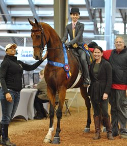Katie Rich and Out Of Hand display their tricolor ribbons with mom and dad, Sarah and Alan Rich and trainer/instructor, Nicole Foster, after winning the Amateur/Junior Exhibitor Three-Gaited Jackpot.
