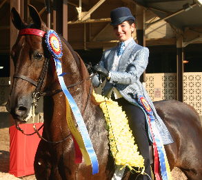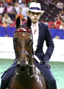 Surviving a tail brace issue during conformation judging that had assistant Sarah Lucht working carefully around his back end, CH Harlem’s Hot Ticket took the last pass in the Junior Exhibitor Five-Gaited 13-and-Under Championship. Nick Neviaser was aboard for his mom, Susan Neviaser, who was receiving congratulatory hugs from Nick’s cheering section as she reached for her camera to capture the moment. Hot Ticket and Nick show under the direction of LaFleur-VanEss Stables. He shows with their trademark go-forward attitude and aggressiveness. Suki Snowlet and Calee Dillon were Reserve Champions, repeating their finish from the qualifier as well as from last year’s Louisville where they were reserve twice as well.
