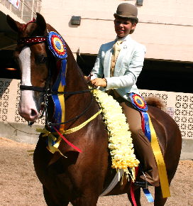 Maureen Lydon made Rich Campbell take another run down to the winner’s circle, which he was only too happy to do. Maureen got the fast trip down to the far end with Mr. Lucky Man, the Junior Road Pony World’s Champion of Champions for Gene Gallmeier. Lucky Man is by Mr. Hawkeye and out of Spirit’s Lucky Luci. He is a product of Rudy and Sharon Lewis’ breeding program. Velvet King and Dr. Alan Raun were reserve. This one was bred by Doc Raun and is by Dun-Haven Little King and out of Heartland Velvet Rose.