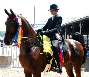 Section Two brought Carter Cox down victory lane with the bay gelding, Sir Yes Sir, for Jamie Wise Lanier. He is by Master Class, by Oak Hill’s Dear Sir and out of CH Reedann’s Nighty Nite, Jean McLean Davis’ grand Ladies Three-Gaited World’s Champion. Nighty Nite was by CH Night Prowler. Sir Yes Sir is out of Pure Radium, a Penny’s Superior Stonewall/Supreme Sultan cross. Second in this one went to the Tri Color Ventures entry, Catalyst’s Blonde Ambition and Jim Lowry. The mare is obviously by Catalyst. She is out of Art Work, making her a full sister to Catalyst’s Work Of Art, shown to a 3-Year-Old Five-Gaited win by Jim Lowry in 2006 and going for a possible Junior Five-Gaited World’s Championship tonight with Andy Freseth. They finished reserve in the Mare qualifier. Sandy Currier was third with the homebred Shoobop Shoobop filly, Bebop Lady, another fine product of the Perwiens’ breeding program.