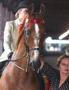 The 13-and-Under Three-Gaited Show Pleasure qualifier had its first section winner in the form of Harlem’s Moving Man and Taylor LaFargue. Until last year the mount of Drew Taylor Hewitt, Harlem’s Moving Man makes a return trip down to Freedom Hall’s victory lane, as he was a 41-and-Over Pleasure winner here with Vicki Reed back in 2003. Moving Man is by Harlem Globetrotter and out of Moving Time, a Supreme Heir mare. Jack Magill trains this team. Reserve went to the Pam Langford entry of At First Sight and Tyler Miles. The six-year-old son of CF First Night Out was a Futurity star at Louisville as a young horse, winning the ASHA Kentucky Yearling Futurity in 2002. CH CF First Light Of Dawn and Maya Manilow looked strong and polished in third, while the white ribbon went to CH New York Style and Ben Ferreby. This was definitely a class that was long on talent.