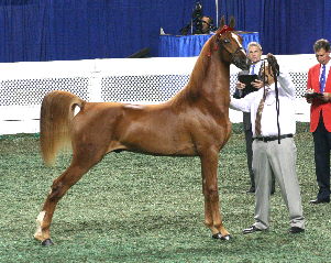 The Yearling Breeders’ Open went to Pocket Aces, an entry of Blythewood Farms. He is a chestnut son of Richard Witt’s bay stallion, Major Wager. He is out of CF Chief’s Happy Days, making him another complete Blythewood product to win an in-hand class in Freedom Hall. Chief’s Happy Days is by Arrowhead Chief, the Yorktown son. She is out of Happy Twenty-First, the dam of CF First Night Out. Reserve to Pocket Aces was Nuttin’ Doing with Peter Palmer showing for Carl T. Fischer. This dark chestnut is a son of the celebrity stallion, Undulata’s Nutcracker, a cross of Caramac and a The New York Times mare. Nuttin’ Doing’s dam is by Periaptor and out of a Sultan’s Royalty mare. He is a great cross of a lot of different families. CH Will Shriver, Vanity’s Sensation of Crebilly, New Yorker, Native Promise, Wing’s Fleet Admiral, Supreme Sultan and Family Jewels all appear on his pedigree.