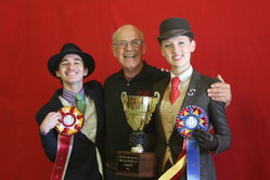 Mark Van Zomeren of Timber Hills Farm celebrates with Sydney Robbins and David Stelljes after they took first and second in the Iowa Saddle Seat Equitation Finals wrapping up the Iowa Fall Classic horse show. Eligible riders must be junior exhibitors, must be a member of the Iowa Horse Show Association, compete in three of the accredited Iowa horse shows and then show in the finals. Robbins won the $1,000 scholarship and Stelljes won $500.