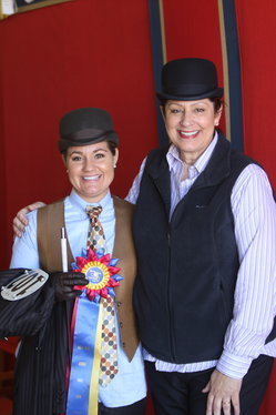 Proud new owner Maureen Mietelski congratulates Julie Anne Wroble after a great debut with Stick To Your Guns to win Open Park Pleasure Stake at Great River Benefit.