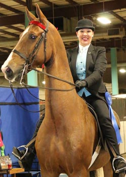 Undulata’s Mister Machine and Lauren Miller had the winning ride in the Adult Three-Gaited Show Pleasure 39 & Over qualifier at the UPHA/American Royal under the direction of Tommy Benton and Kendall Blue.