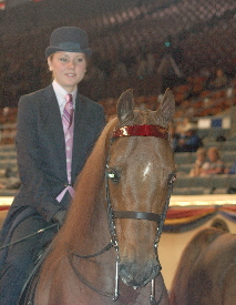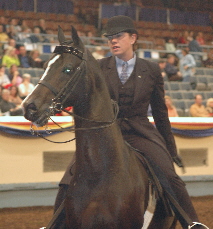 The previous park harness class was a perfect way to warm up the crowd for the next class, the Grand National Park Saddle Junior Exhibitor 15 and Under class. Again in perfect agreement with one another, the judges believed Ultra’s Dark Angel and Katherine O’Connor to be the very best of this division. Ultra’s Dark Angel, the 2004 Three-Year-Old Park Saddle World Champion, enjoyed another trip down Oklahoma's victory lane competing this year for owner Laurette Walsh under the direction of David Young. Marathon’s Electrafire and Anna McLallin received a warm round of applause for their reserve efforts for Jacqueline Clapp to continue a busy day for PlayMor Farm.