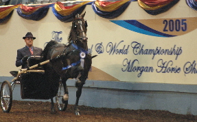 The judges next evaluated the two-year-old pleasure driving stallions, driven by veteran trainers including Gerry Rushton, Mike Carpenter, Jim Lowry and Jeff White. The crowd agreed with the judges’ unanimous choice of the bolding-moving Sacred Path Indiana Jones and Jim Lowry. Presenting this time for Diane and Lon Seitz and Sacred Path Morings, this was Lowry’s second victory pass of the day. Jeff White and MEM Blue Chip made a strong effort for reserve for George Schott and Maine Event Morgans.
