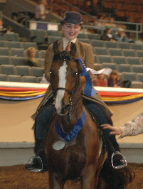 Closing out the morning session, eleven 15-year-olds answered the call for hunter pleasure. With an outstanding season in 2005, Twin Peak Heritage and Shannon Fox were recipients of the fourth unanimous decision of the day in Show Arena 6. They were met in the winner’s circle by Mary Cockriel. Taking over from Leslie Hunt, Rachel Colley had a effortless ride on Treble’s Fancy Fellow for reserve. Owned by Tiffany Decker, this horse has amassed quite a fancy record in California over the past couple of years.