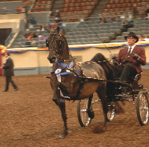 Following the dressage presentations, the four-year-old park harness mares and geldings made their way into the coliseum to be judged by Lewis Eckard, Lonnie Lavery and Phil Price. At the conclusion of the class, attendants literally raced into the ring to greet their entries, much to the crowd’s delight, and it seemed to be a unanimous decision that Ron Roesink topped this field of four. As far as the horses in this class go, Boxford Bulls and Bears and John Warner carried the unanimous winning ticket home to the Blevins family. Grove Pointe’s outstanding week continued as CBMF Solitaire and Tim Roesink were named the reserve champions for Copper Beech LLC.