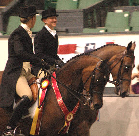 The Classic Pleasure division once again featured some of the largest and most competitive classes of the show. Friday night's Classic Pleasure Saddle Championship was one of the largest with 13 teams vying for top honors. Stonecroft After Midnight and Amy Gendjar showed supreme style as they earned the tricolor ride. David Rand greeted them in the winner's circle after the win for Dantree Farm. SBS Power Play and Kristi Evans turned in a consistent ride and made the reserve pass for the second year in a row following a repeat victory in the ladies class under the Moreland Farm banner.