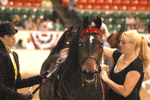 The In Hand Stallion division capped off the in hand competition with more crowd-pleasing performances. The get of World Champion Stallion LPS The Boogie Man are starting to make their presence known as Leatherstocking Elvis took his place in the winner’s circle in the Yearling Colts and returned to be named Reserve Junior Champion Stallion with David Rand assisting Coby Holowacz in the presentation for Douglas and Adrienne Gable. CBMF Arbitrage (Ben’s Rhapsody x Ariel) has certainly grown up since his reserve world title in 2006 as he stood proudly as the Two-Year-Old Stallion winner, Junior Champion Stallion and Reserve Grand Champion Stallion. James and Harry Sebring presented the charismatic youngster to the honors for owner/breeder Ann Hailey’s Copper Beech.