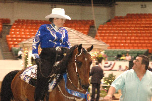 Erica Mitchell and her pretty mare Wait A Second picked up right where they started out last year as they collected the Amateur Western Pleasure Championship and the ladies amateur blue under the Best Of Both Worlds banner. It was a pair of pretty bay mares on victory lane as ECP The Seventh Stone and Marion Bengtson captured the reserve honors following a blue ribbon ride in the amateur qualifier.
