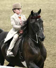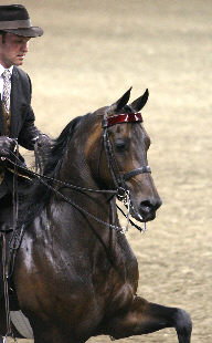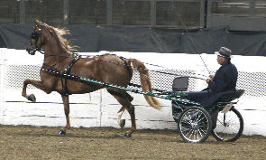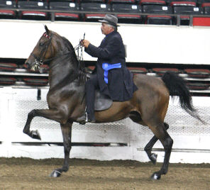 The list of world champions does not stop with those few. Spectators were in for a big surprise when the Open Park Harness class was called to the ring. A dark figure was seen trotting down the shoot and moments later World Champion Stonecroft Trilogy was marching through the gate. John Scheidt was at the lines of the bold, bay superstar. As the stallion strutted down each wall, knees breaking over the rail, and taking each commanding stride in flawless perfection, it was no surprise when he was called out as the winner. The grand stallion returned with Nelson Green aboard to take claim to the Park Saddle Stake tricolor for the third consecutive year. Reserve in the class went to JW Phantom with Ernesto Chavallo aboard for Judy Whitney-Harris. Phantom is a big, strong going youngster who won the Junior Park Saddle Stake the day before.