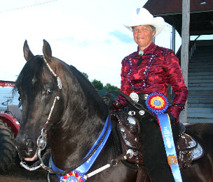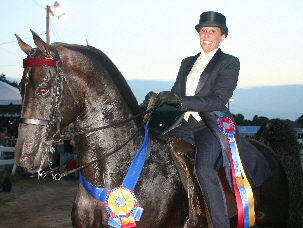 Something Wicked and Amy Neifert enjoyed a pair of exceptional performances for Copper Beech LLC. On Tuesday night they picked up the red ribbon with a bold ride in the Park Saddle Mares and Geldings. They returned the following night and stepped into the record books besting a phenomenal field of world titled performers in the nine-entry Ladies Park Saddle. They were greeted in the winner’s circle by Harry and Carolyn Sebring for the presentation of the blue ribbon and flowers. Sandy Hendrick enjoyed a memorable show with her mares as she matched up with her always-elegant Queen’s Victorian Lady for the red ribbon in this memorable ladies class directed by David Rand. The amazing list of ladies ribbon winners also included; Erotic Dancer and Dawn Fire, Patchwork Simply Amazin and Donna Zimmerman, CN’s Stylish Debut and Allyson Wandtke, KD Hot To Trot and Maureen Cartelli, Cedar Creek Arabella and Shirley O’Gorman, and CBMF Leading Man and Catherine Ehnle.