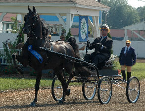 MEM No Inhibitions made the return trip to her native New England carrying the colors of The River’s Edge. Bob Kellert opened the week driving down victory lane in the nine entry Open Roadster To Bike on Monday night and closed out the week with the East Coast Roadster To Bike Reserve Championship. Owner Alison Bendele breezed across the finish line in the Roadster Under Saddle to the cheers of the large Friday night audience in the grandstand ring.