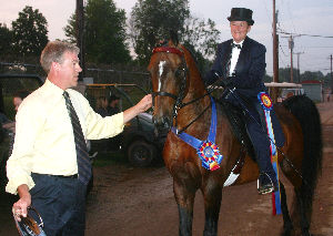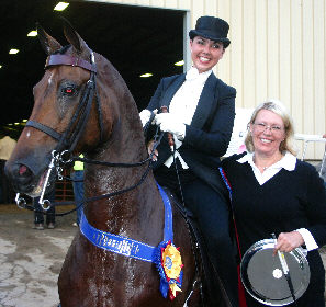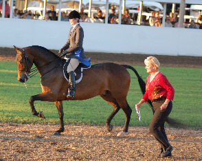 It was certainly a fait accompli for Katie Mair and Marie Frank’s handsome bay as Fait Accompli added his name to the trophy as the 2007 champion. The Futurity French Command son earlier bested the field of multi-titled entries in Wednesday evening’s Ladies English Pleasure Gelding class. MEM Exotica made her presence known as Shanna Gish rode the Tri Color Ventures entry to the reserve tricolor for the second year in a row. It was a tricolor sweep for the get of Futurity French Command as Exotica wore the reserve tricolor from the second place finish in the ladies mare class. Jenny Taylor teamed up with Narragansett Spirit to garner the yellow ribbon in the championship following a trip to the winner’s circle in the ladies mares for Hobby Horse Enterprises and trainer Rick Stevens. The domination of the Futurity French Command get continued as the world titled team of Nicoria and Amy Gatewood Gendjar picked up the white ribbon in the championship following a lovely ride for the red ribbon in the gelding qualifier for Dantree Farm.