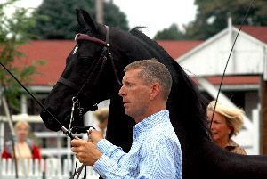 Robert Neimeth was on the lines of the reserve champion for the second year in a row as this year Stonecroft Sudden Impact carried the reserve honors back to Misty Meadows Farm. The crowd erupted when JW Raire Review and Erin Kelley were called out for the third place ribbon. David Rand earlier directed this entertaining team to the blue ribbon and flowers in the ladies class. The crowd continued their applause as the impressive amateur qualifier winning team of Tara’s Firewalker and Krista Headley picked up the white ribbon under the direction of Ken Swanson in this much-discussed competition.