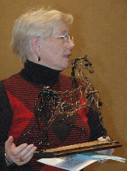 Coby Holowacz showed off the wire horse created by Dan Williams on which she placed the winning bid.