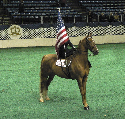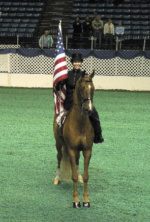 Dunn often helps open horse show sessions with Nickers helping her carry the American flag. Nickers is also used as a lesson horse and has carried several young riders to their first show ribbons. Seventy-something Lorrie Dunn frequently trail rides Nickers in the hills of Southern California. And where Nickers has probably had the most influence as an ASB ambassador is as a petting horse for numerous Equine Affairs and other similar events with hundreds of adoring fans to his credit.