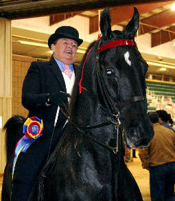After Dustin Lassett rode CH Callaway’s No Problem to the winner’s circle in the Five-Gaited Show Pleasure qualifier, he handed the reins over to his grandmother, Jean Meyers. Meyers had a great time in the class as she was met by Steve Hanks in the winner’s circle in the championship.
