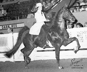 Then for many years they showed with Dale and Glenda Pugh in Missouri. In 1983 the World’s Championship Horse Show held the Three-Year-Old Park Pleasure Futurity World’s Championship for the very first time and Riggins won it with a horse named Diamond Kite. That same year she had the World’s Champion Parade Horse, bringing down the house at the American Royal – home of the Parade Horse World’s Championship – with the legendary gray horse, CH Sterling Performance. CH Sterling Performance was trained by Danny Breakbill.