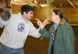 USEF Steward Mary Lynn Whitley and Cascade Stables assistant trainer Jeremey Granier were having a light moment in the warm up ring. Granier was "turned in" by fellow exhibitors for popping bubbles too loudly.