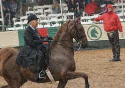 Trainer Evan Orr watched as Vickie Byrd and Iconium made the victory pass in the Amateur Five-Gaited Stallion/Gelding class. A couple of downpours soaked the Red Mile on Tuesday evening, the worst being during this class.