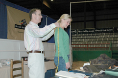 Dale Becker of Becker Brothers Ltd. travels approximately 30,000 miles a year servicing clients at horse shows. He measured Bridget McNeese for a new jacket during the recent Pin Oak Charity Horse Show in Houston, Texas.