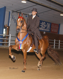 Carlos Chavez wears a tan suit of his design when showing CH Triumphant. His dark brown suit and yellow tie blend well with his chestnut gelding.