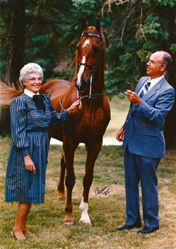 Flashback with Dotty and Dr. Alan Raun and their number one rated sire Stonewall's Main Event. A recent recipient of the ASHA Lifetime Achievement Award, Dr. Raun stood Main Event at his Reedannland from 1980 until his passing. He had purchased the son of Starheart Stonewall and Katie Boone (by Ace O'Goshen) from the Gamble family's Happy Valley Farm, Danville, KY, where he was a stablemate of the renowned Buck 'N Wing. Dr. Raun syndicated Main Event, one of the first Saddlebred stallions to do so.